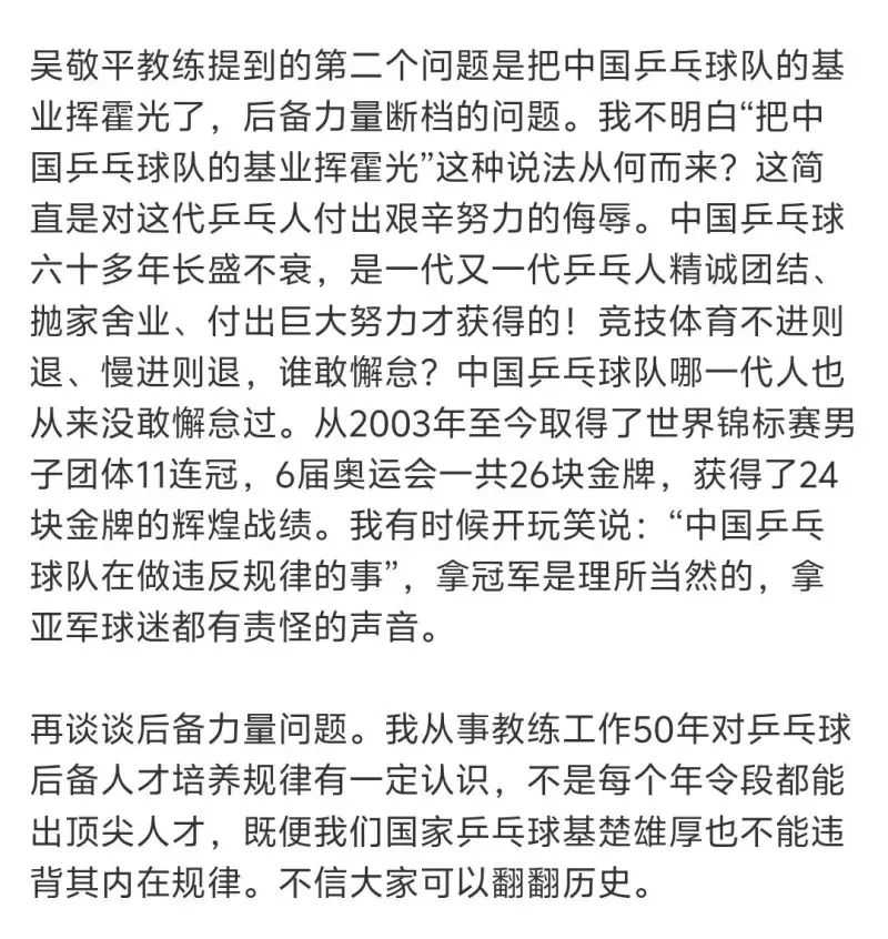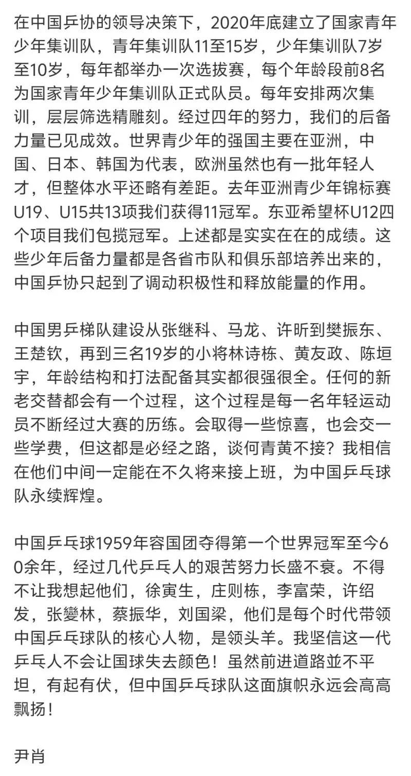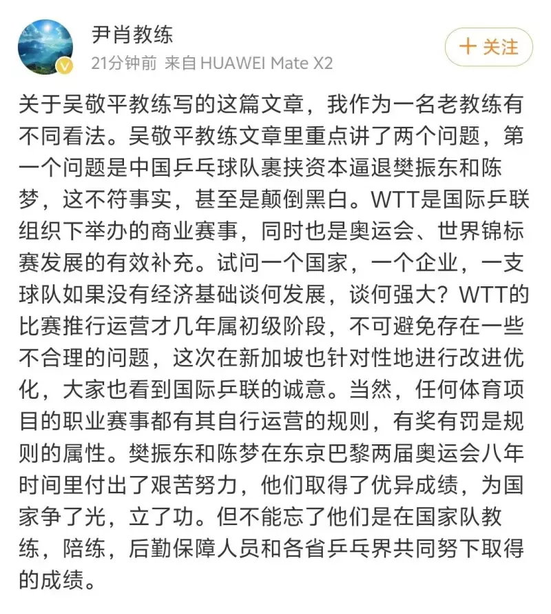 2月15日,乒乓资深闇练吴敬平在社媒上抒发了对现在乒坛乱象的诉苦以及关于WTT赛事举止的不悦。刚刚前国乒闇练尹肖在社媒发长文讲演吴敬平。